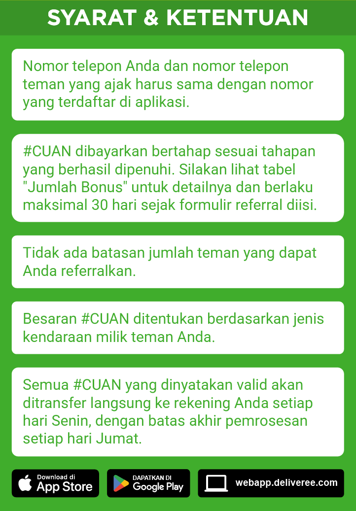 Dapatkan #CUAN melimpah dengan mengajak teman driver bergabung di Deliveree. #CUAN akan langsung masuk ke rekening Anda setiap Senin setelah teman yang diajak sukses membuat akun dan menyelesaikan pesanan pertama dalam 30 hari.